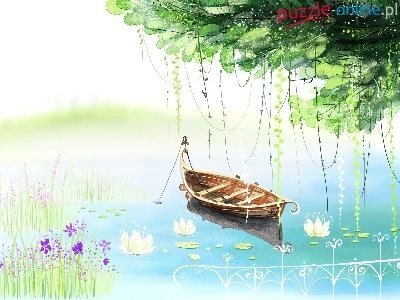 Puzzle Drzewo, Jezioro, Łódka, Kwiaty