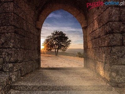 Puzzle Drzewo, Mury, Brama, Promienie słońca