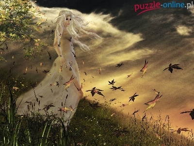 Puzzle Drzewo, Kobieta, Ptaki, Fantasy