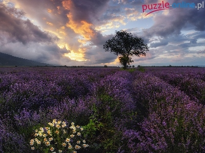 Drzewo, Wschód słońca, Lawenda, Rumianki, Chmury
