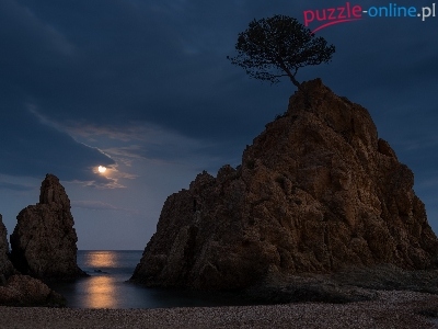 Drzewo, Księżyc, Morze, Skały, Chmury