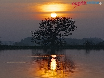 Puzzle Drzewo, Jezioro, Zachód Słońca, Odbicie