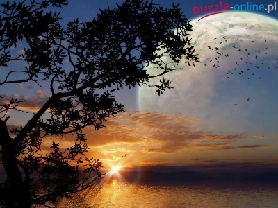 Puzzle Drzewo, Zachód, Słońca, Ptaki