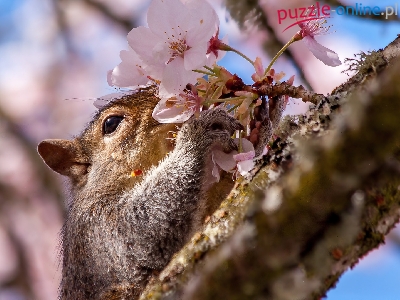 Puzzle Drzewo owocowe, Wiewiórka, Kwiaty