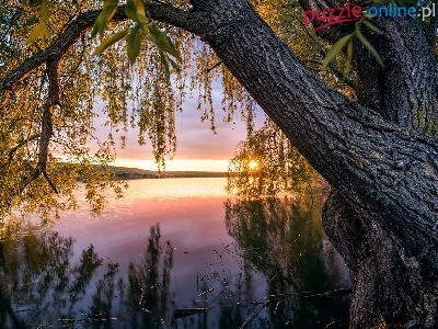 Puzzle Drzewo, Rzeka, Pochylone, Wschód słońca