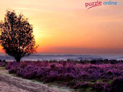 Drzewo, Mgła, Lawendowe, Pole, Zachód Słońca