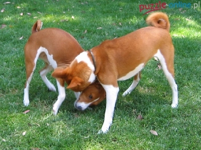 Basenji Ogon, Pies, Taxi, Konia Wózek, Basenji, Trzy, Pieski, Szczeniaki Basenji, Pies, Mordka Pies, Zamyślony, Basenji Basenji, dwa, trawa Drzewka, Basenji, Jesień, Pies, Kłoda, Liście