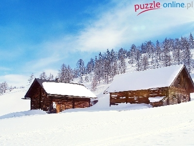 Dwa, Śnieg, Domy, Zima, Drzewa, Drewniane