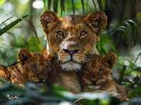 Las, Lwica, Lew, Dwa, Liście, Lwiątka
