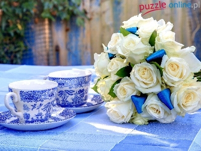Puzzle Dwie, Bukiet, Róż, Filiżanki
