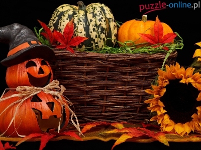 Dynie, Słoneczniki, Kompozycja, Halloween, Kosz
