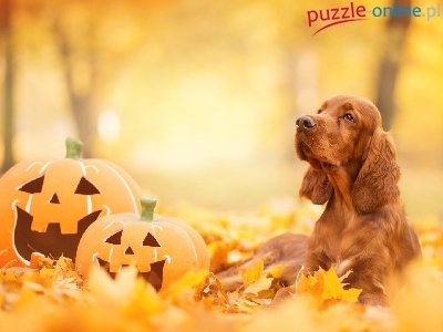 Jesień, Dynie, Pies, Cocker spaniel angielski, Liście