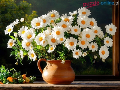 Kwiaty, Dzbanek, Margerytki, Okno, Parapet