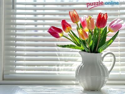 Żaluzja, Bukiet, Tulipany, Dzbanek, Grafika, Okno