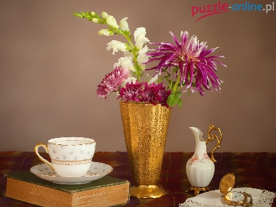 Astry, Kwiaty, Filiżanka, Książka, Serwetka, Zegarek, Kompozycja, Wazon, Dzbanuszek