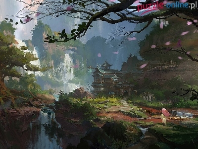 Góry, Obraz, Japoński, Dom, Parasolka, Wodospad, Malarstwo, Rzeka, Dziewczyna