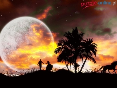Dziewczyna, Drzewo, Niebo, Księżyc, Konie, Chłopak
