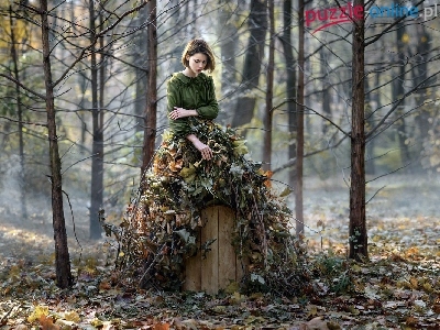 Las, Dziewczyna, Mgła, Liście, Jesień, Drzewa, Klucz