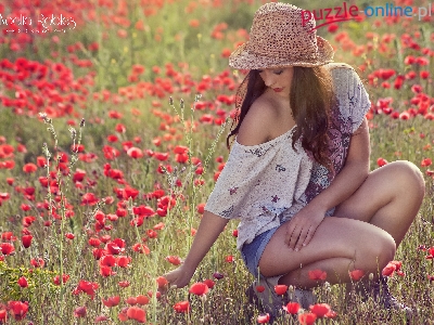 Puzzle Dziewczyna, Łąka, Maki, Kapelusz