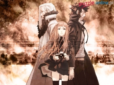 Speed Grapher, smutna mina mężczyżni, Speed Grapher, dziewczyna czarna postac, Speed Grapher, niebieskie tło aparat, dziewczynka, Speed Grapher dziewczyna, Speed Grapher, krótka spódniczka