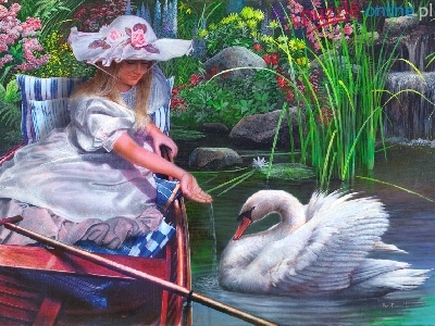 Łabędzie Niebieska, Kobieta, Blondynka, Sukienka Słoneczniki, Kobieta, Motyle Bukiet, Dziecko, Kwiaty Zachód, Morze, Łódka, Słońca Ogród, Dom, Thomas Kinkade Dziewczynki Łabędź, Jezioro Małe, Dziecko Łabędzica, Pisklęta Domy, Para, Most, Zima Marta Dahlig, Skąpstwo Szuwary, Jezioro, Łódka, Brzeg Las, Jeleń, Sarna, Zima