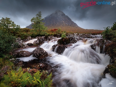 Chmury, Region Highlands, Szkocja, Góra, Rzeka, Drzewa, Paprocie, Buachaille Etive Mór, Kamienie