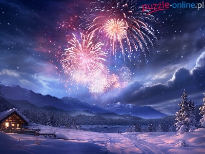 Świerki, Grafika, Dom, Fajerwerki, Góry, Zima, Sylwester