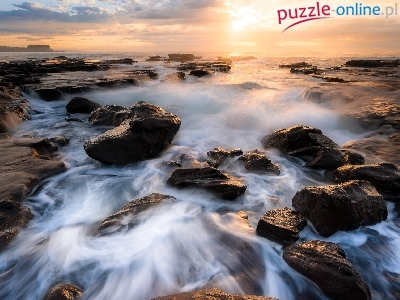 Puzzle Fale, Morze, Skały, Zachód słońca