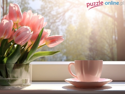 Tulipany, Filiżanka, Bukiet, Grafika, Okno