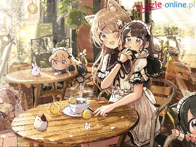 Dwa, Anime, Dziewczyny, Filiżanka, Postacie, Cztery, Stoły