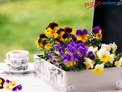 Filiżanka, Bratki, Kompozycja, Kolorowe, Waliza, Herbaty