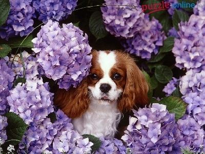 fioletowe, King Charles Spaniel, kwiatki