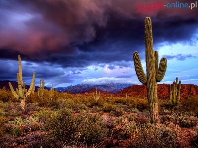 Fioletowo, Chmury, Kaktusy, Saguaro, Granatowe