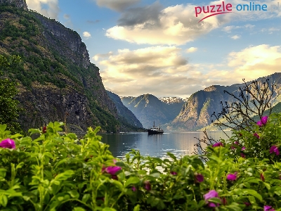 Statek, Fiord Aurlandsfjord, Kwiaty, Norwegia, Wieś Flam, Góry