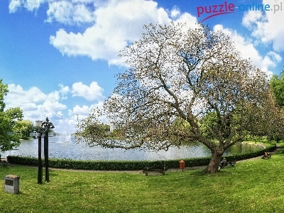 Fontanna, Chmury, Park, Staw, Alejki