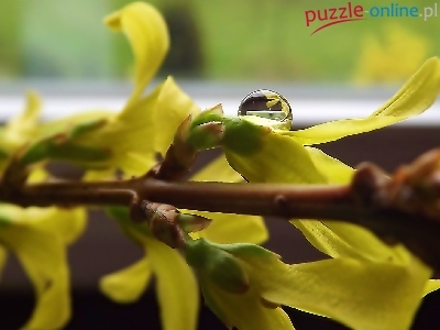 Forsycji, Makro, Gałązka, Kwitnącej, Kropla