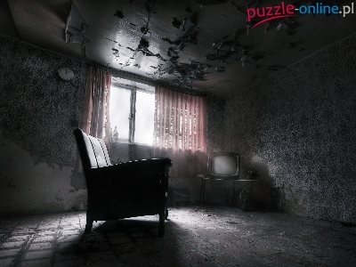 Fotel, Zniszczony, Telewizor, Zaniedbany, Pokój, Okno