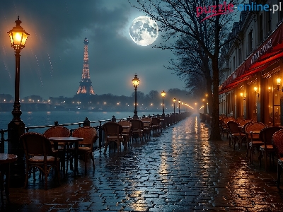 Francja, Grafika AI, Paryż, Restauracja, Latarnie, Noc, Bulwar, Deszcz
