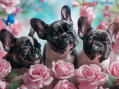 Kwiaty, Trzy, Buldog francuski, Psy, Grafika, Róże