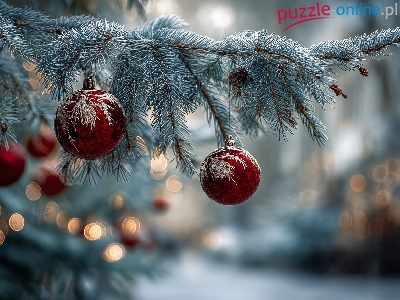 Świerk, Czerwone, Boże Narodzenie, Bombki, Grafika AI, Gałązka