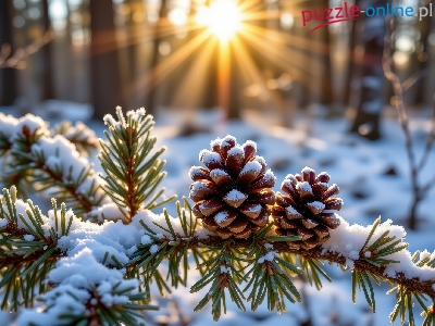 Słońce, Iglak, Zima, Gałązka, Grafika AI, Szyszki