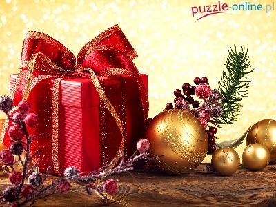 Puzzle Gałązki, Prezent, Bombki, Kompozycja
