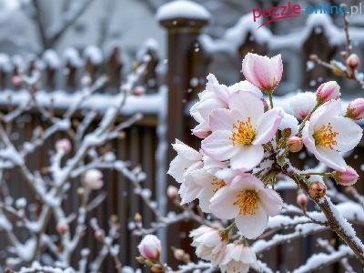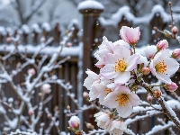 Ogrodzenie, Ośnieżone, Kwiaty, Gałązki, Grafika AI, Krzew