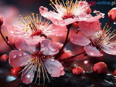 Pąki, Drzewo owocowe, Kwiaty, Krople, Różowe, Rozwinięte, Gałązki