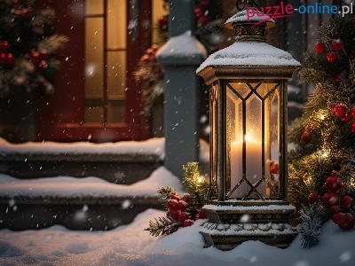 Schody, Drzwi, Śnieg, Lampion, Świeca, Jagody, Zima, Gałązki