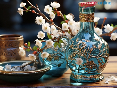 Stół, Ozdobna, Butelka, Gałazki, Kompozycja, Waza