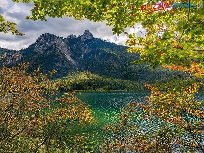 Liście, Jesień, Chmury, Bawaria, Alpsee, Alpy, Gałęzie, Drzewa, Góry, Jezioro, Niemcy