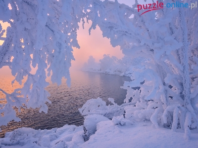 Zima, Gałęzie, Drzewa, Jezioro, Ośnieżone