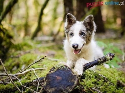 Puzzle Gałęzie, Border collie, Pniak, Mech