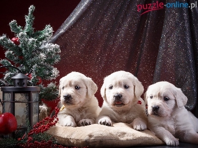 Choinka, Golden retriever, Świąteczne, Szczeniaki, Lampion, Ozdoby